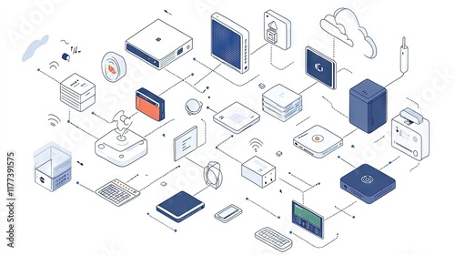 Fototapeta premium Cloud computing visualization featuring interconnected devices representing IoT and digital storage solutions.