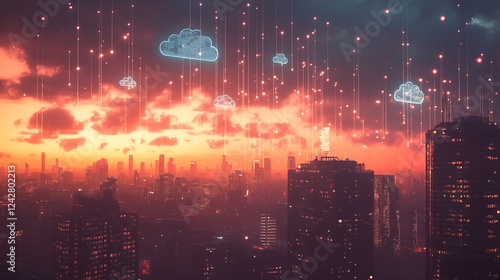 © oris, Fototapeta premium Cloud Data Network Over Illuminated Cityscape at Sunset