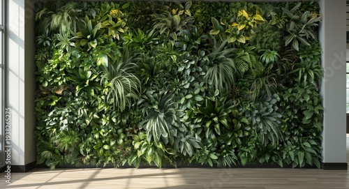 © AkuAku, Obraz premium Cloud forest inspired vertical garden with mossy, olive, and jade toned tropical plant textures