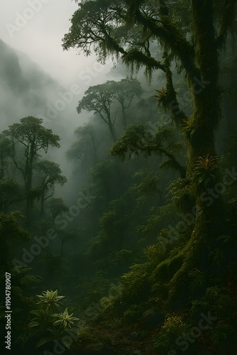 Obraz premium Cloud forest on steep slopes with mossy trees, drifting fog, epiphytes, and soft mystical light