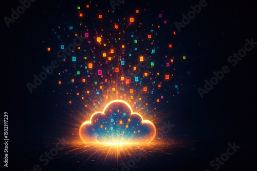 © PrusarooYakk, Obraz premium cloud gaming and streaming concept. Digital cloud with colorful data particles illuminating the dark background.