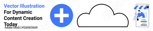 Obraz premium Cloud icon alongside a blue plus symbol and a storefront graphic with a user browsing. Ideal for data sharing, online business, digital services, e-commerce, teamwork, cloud storage, flat landing