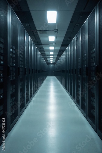 © kineter_ai, Obraz premium Cloud Services Powerhouse: Infinite Server Rack Aisle Representing Big Data Processing