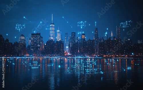© Itsaree , Fototapeta premium Cloud storage and digital network icons illuminated above Manhattan skyline, symbolizing online data flow and connectivity, advanced technology, smart city concept