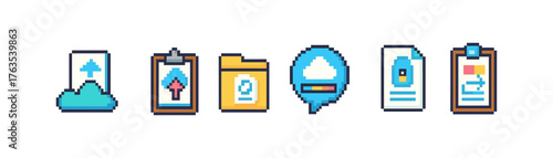 © Vasya, Obraz premium Cloud storage flat icon set. Upload, download, folder, data pixel icons collection