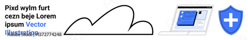 Obraz premium Cloud surrounded by shield with cross icon and interface screen. Ideal for technology, security, healthcare, data management, cloud computing, online services, simple landing page