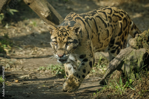 Fototapeta premium Clouded leopard is walking towards from the shadows to the light/big cat male...