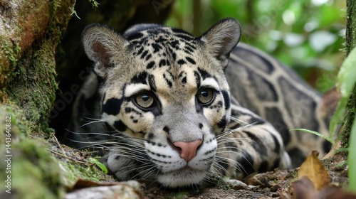 Obraz premium Clouded Leopard Reclining in Rainforest Niche, Intense Gaze