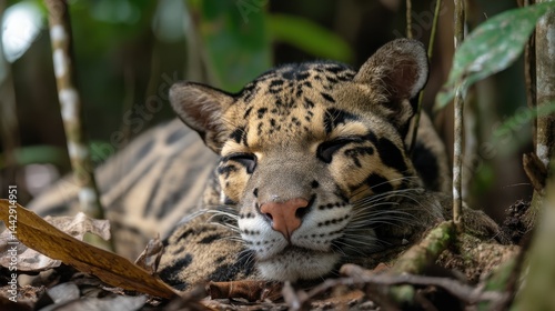 © riverdhan, Obraz premium Clouded Leopard Resting in Lush Foliage