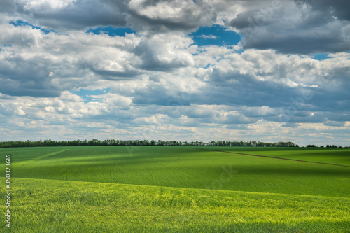 Fototapeta premium clouds above green wheat fields un spring day with copy space