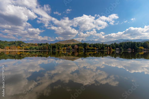 © hannesthirion, Obraz premium Clouds and autumn colored trees reflect on the water