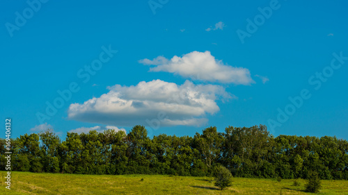 © APHOTOSTUDIO, Obraz premium Clouds and meadow with forest.