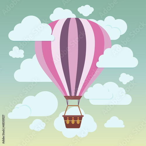 Fototapeta premium Clouds and striped hot air balloon on a blue background