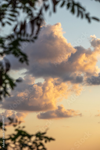 © Aktrisa, Obraz premium Clouds at sunset through the leaves