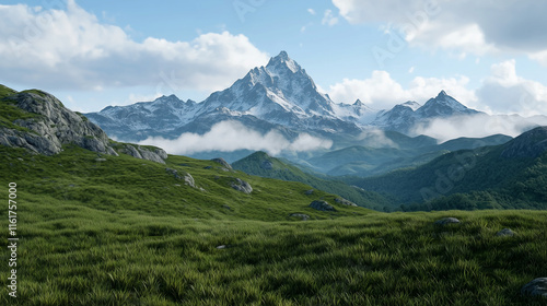 © Kevin, Fototapeta premium Clouds drift over a mountain range showcasing a grassy hillside