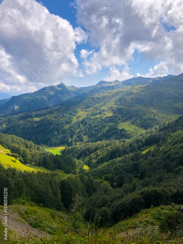 Fototapeta premium Clouds drifting over mountain peaks in Abkhazia, creating a dramatic and serene landscape