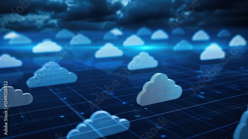 © Nuchylee, Fototapeta premium Clouds floating over digital grid symbolize secure cloud computing