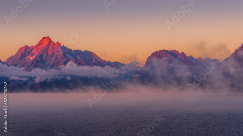 Fototapeta premium Clouds hanging over Jackson Lake as the sun rises and lights up the tallest peaks of Grand Teton National Park, Wyoming, USA