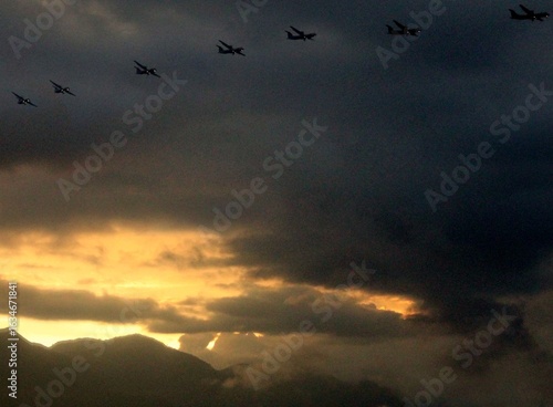 © Sanoyatra, Obraz premium Clouds, Hills Crimson Skies: Nepal’s Sunset Symphony