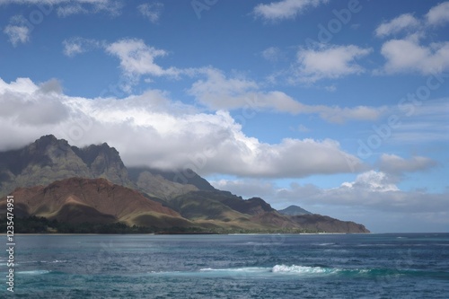 Naklejka premium Clouds hovering over the lush mountains of a tropical island