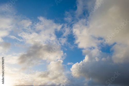 Fototapeta premium Clouds in a blue sky in sunlight at sunrise in spring