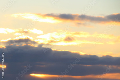 Obraz premium Clouds in the blue sky at sunset or dawn backlit by the sun. Place for text...