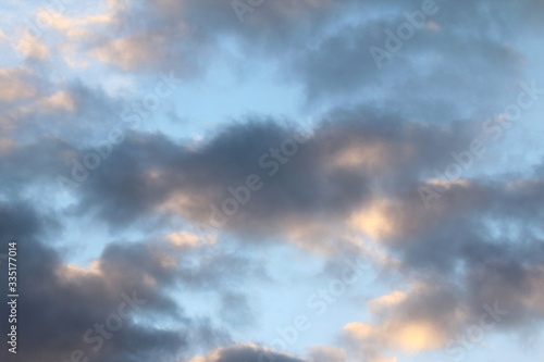 Obraz premium Clouds in the blue sky at sunset or dawn backlit by the sun. Place for text...