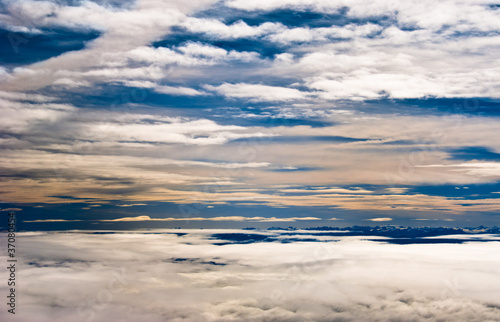 © Evgeniya Moroz, Obraz premium Clouds over mountains background in blue sky
