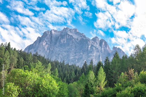 Naklejka premium Clouds over the mountain peak . Green coniferous forest and mountain scenery