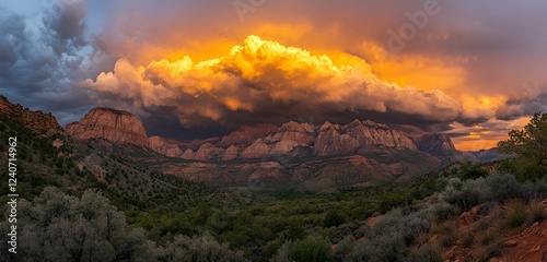 © Malik, Fototapeta premium Clouds rapidly moving over a dramatic mountain range during the golden hour