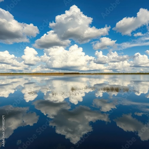 © Sutasinee, Obraz premium Clouds reflected in the still waters of a pond, pond, sky, water