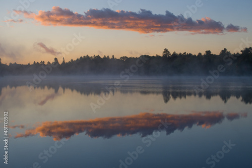 © Shawn Hamilton CLiX , Fototapeta premium clouds reflecting on calm water morning mist hovering over lake at sunrise early morning fog or mist trees forest or woods reflecting in tranquil calming lake water blue sky purple clouds horizontal