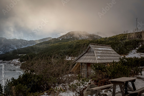 Fototapeta premium Clouds rising over Tatra Mountain valley and covering the peaks. Old wooden...