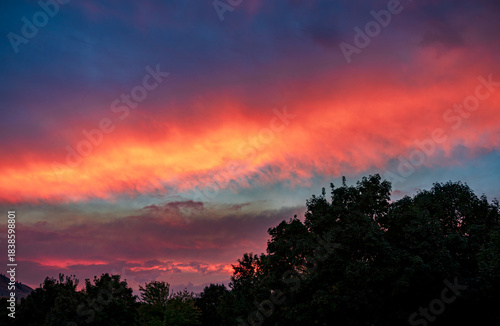 © Scott Bufkin, Fototapeta premium Clouds turn bright colors at sunset from wildfire smoke in the air