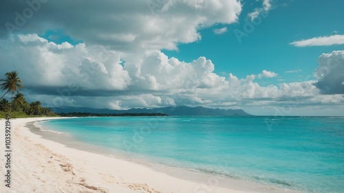 Fototapeta premium Clouds veil the sun, casting a soft glow on azure waves, unveiling a tranquil...