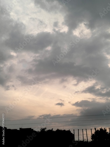 © jorge, Fototapeta premium Cloudscape, Colored Clouds at Sunset near some buildings