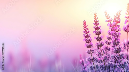 © PBMasterDesign, Obraz premium Cloudy abstract background concept. A serene lavender field under a pastel sky at sunset, capturing nature's tranquility.