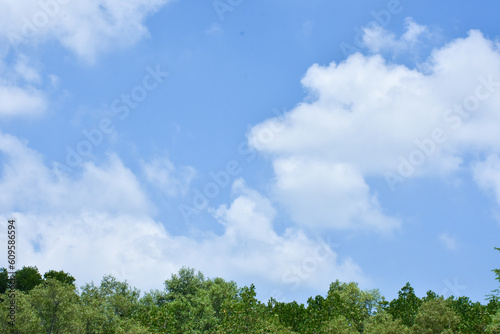 © Suphattra, Obraz premium Cloudy blue sky abstract background, blue sky background with tiny clouds. Sunny blue sky with soft clouds and bright sun against green trees foreground.