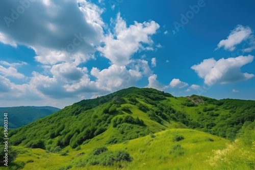 Naklejka premium Cloudy blue sky and green hill mountains are beautiful places. Generative Ai