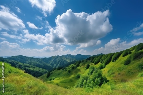 © Areerat, Naklejka premium Cloudy blue sky and green hill mountains are beautiful places. Generative Ai