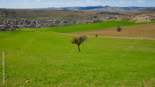 © Vahit Telli, Naklejka premium Cloudy blue sky and spring greenery. Crops emerging from the ground in the fields. Green fields in front of rural village landscape. Dirt country roads, plowed fields and dry trees. Focus is selective