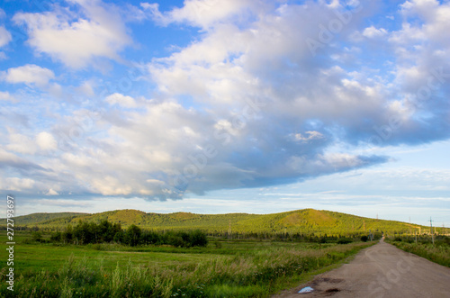 Fototapeta premium Cloudy blue sky on the horizon of Russian fields and mountains. Summer forest...
