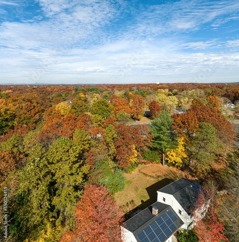 © West Mass Drone/Wirestock Creators, Naklejka premium Cloudy blue sky over suburban foliage scene in Longmeadow Massachusetts