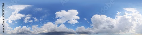 Fototapeta premium Cloudy blue sky with an impending thunderstorm. 360 hdr panorama with cumulus clouds and rain clouds. Spherical format for 3D visualization and sky replacement in drone photos. Seamless loop.