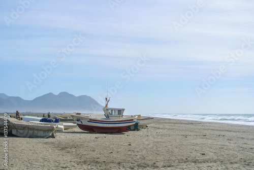 Fototapeta premium Cloudy day at the lonely beach with colored boats on the shore not far from mountains.