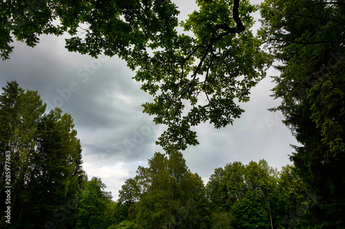 © Olga, Obraz premium cloudy gray sky framed by green trees