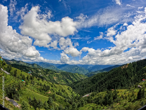 Naklejka premium Cloudy landscape in the rolling hill mountains with bright blue sky