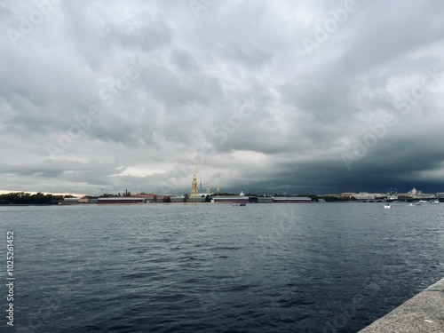 © Oksana, Fototapeta premium cloudy river view, wide city river, cloudy melancholic weather