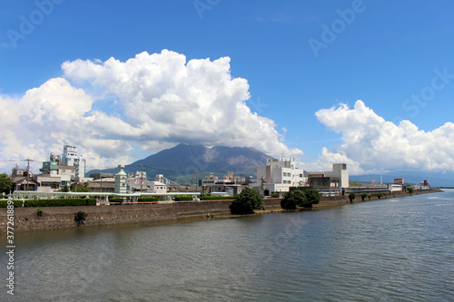 © leodaphne, Naklejka premium Cloudy Sakurajima of Kagoshima, view from the street