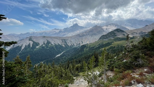 Fototapeta premium cloudy skies over pine trees forest in the Glacier Basin camp area on mount...